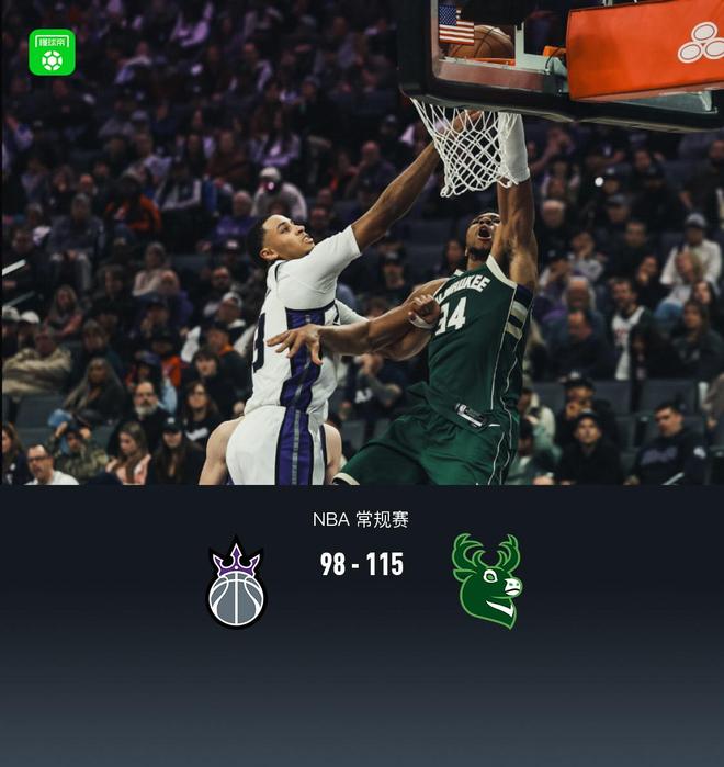 第四节国王施罗德拿下10分,雄鹿字母哥拿下13分,最终国王98-115不敌雄鹿